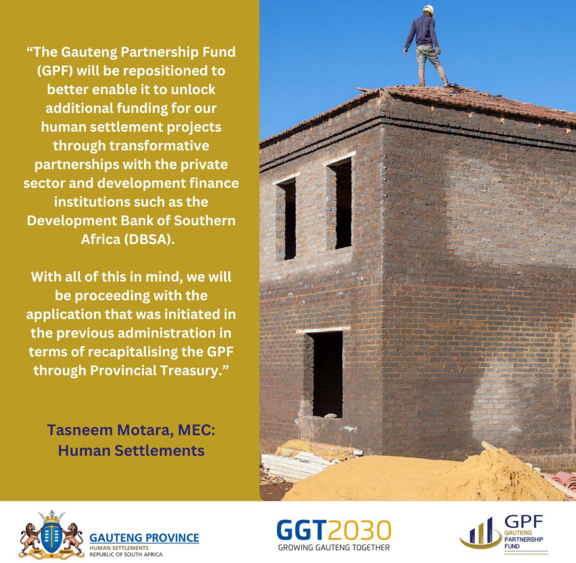 Amongseveralhighlights,MECMotaratouchedonthe roleoftheGautengPartnershipFund(GPF)inhelpingthe departmentaddressthepressinghousingneedsofthe ever-growingpopula�onofGauteng.
