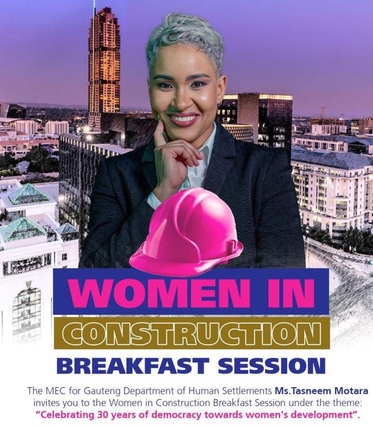 TheMECforGautengDepartmentofHumanSe�lements Ms.TasneemMotara hostedWomeninConstruc�onBreakfastSessionunderthetheme: “Celebra�ng30yeaersofdemocracytowardswomen’s development”