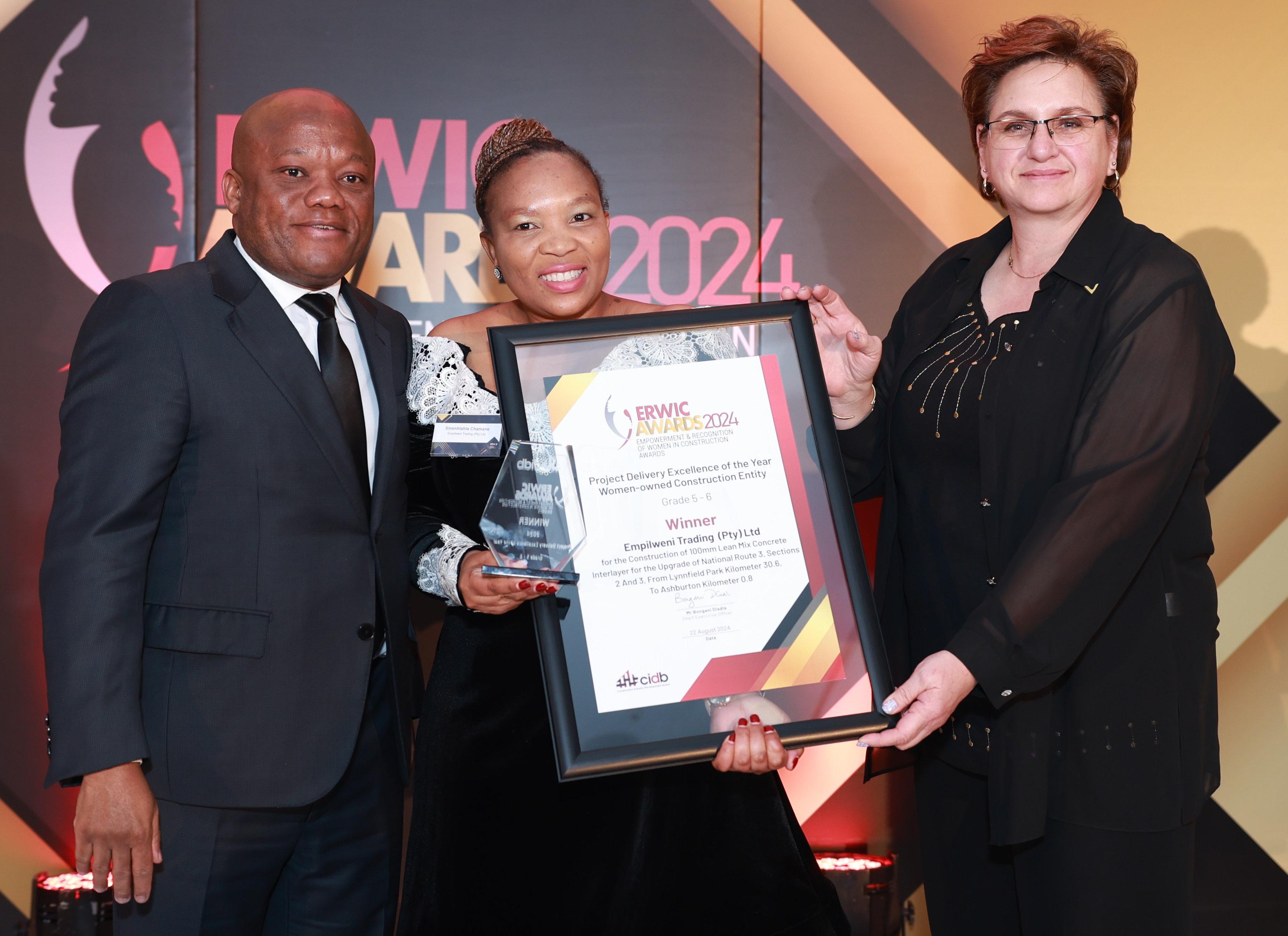 TheProjectDeliveryExcellenceoftheYear–Grade5–6awardwasgivento EmpilweniTrading(Pty)LtdfortheirConstruc�onof100mmLeanMix ConcreteInterlayerfortheUpgradeofNa�onalRoute3,Sec�ons2And3, FromLynnfieldParkKilometer30.6,toAshburtonKilometer0.8project.In secondplacewasTovhaniTradingEnterpriseforthePWR61/22:Major Renova�ons&RepairsatThutoBoswaHighSchoolproject.Thirdplacewas allocatedtoBestEnoughTradingAndProjects535(Pty)LtdfortheInstalla�on, Tes�ngandCommissioningtheElectrifica�onofLeratoPark–411households project