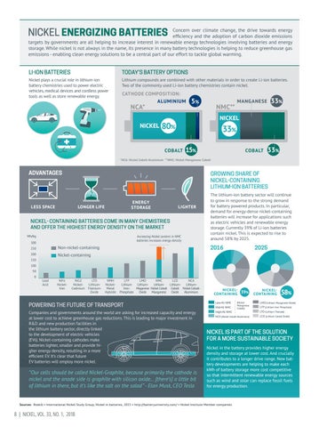 NICKEL IS PART OF THE SOLUTION FOR A MORE SUSTAINABLE SOCIETY Nickel in the battery provides higher energy density and storage at lower cost. And crucially it contributes to a longer drive range. New battery developments are helping to make each kWh of battery storage more cost competitive so that intermittent renewable energy sources such as wind and solar can replace fossil fuels for energy production.