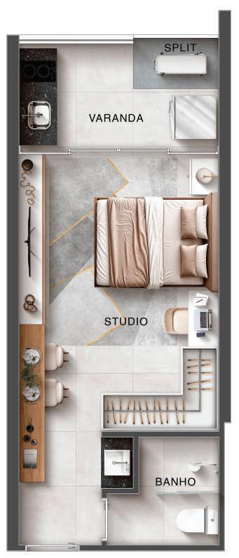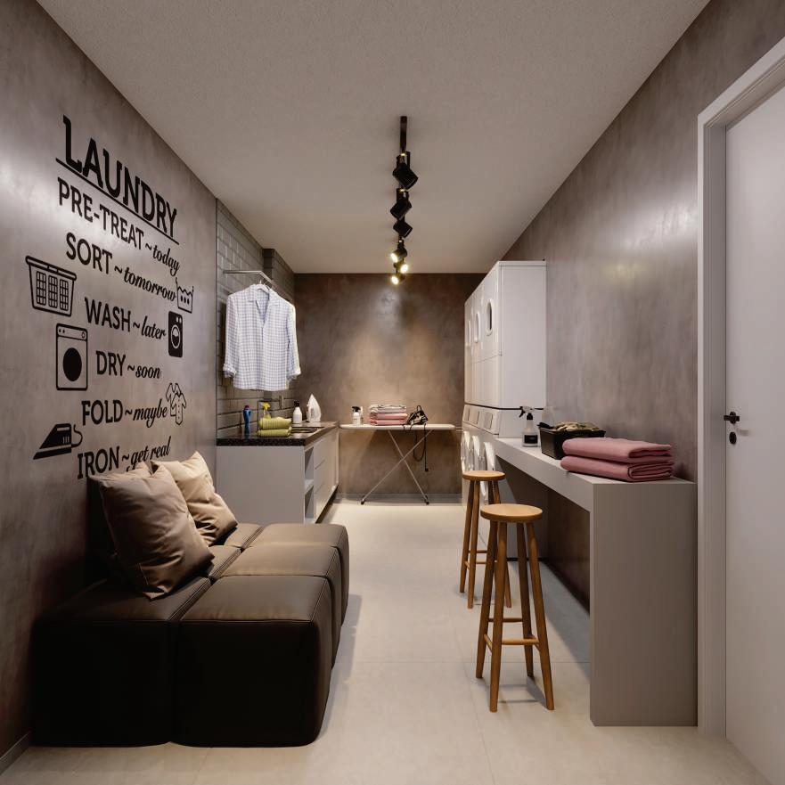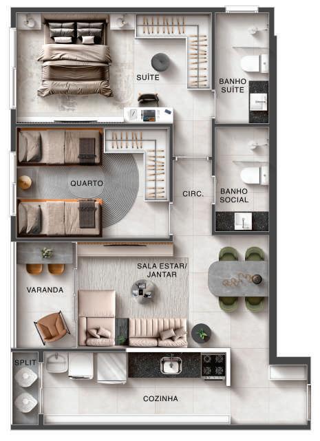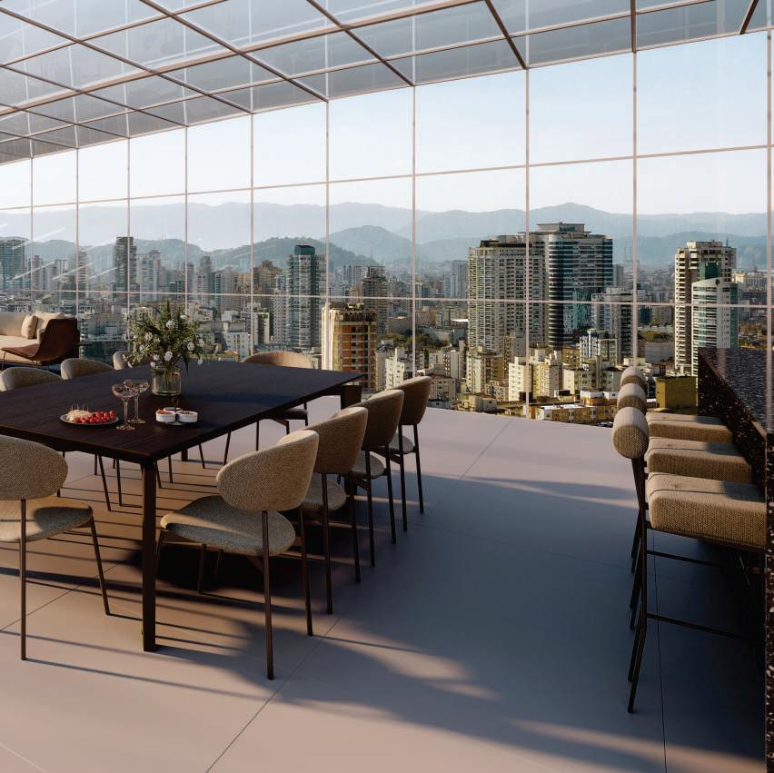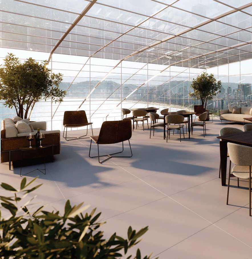 Louças e metais com design contemporâneo. Porcelanato com coeciente de atrito nos banheiros e na cozinha conforme NBR 15.575/2021.