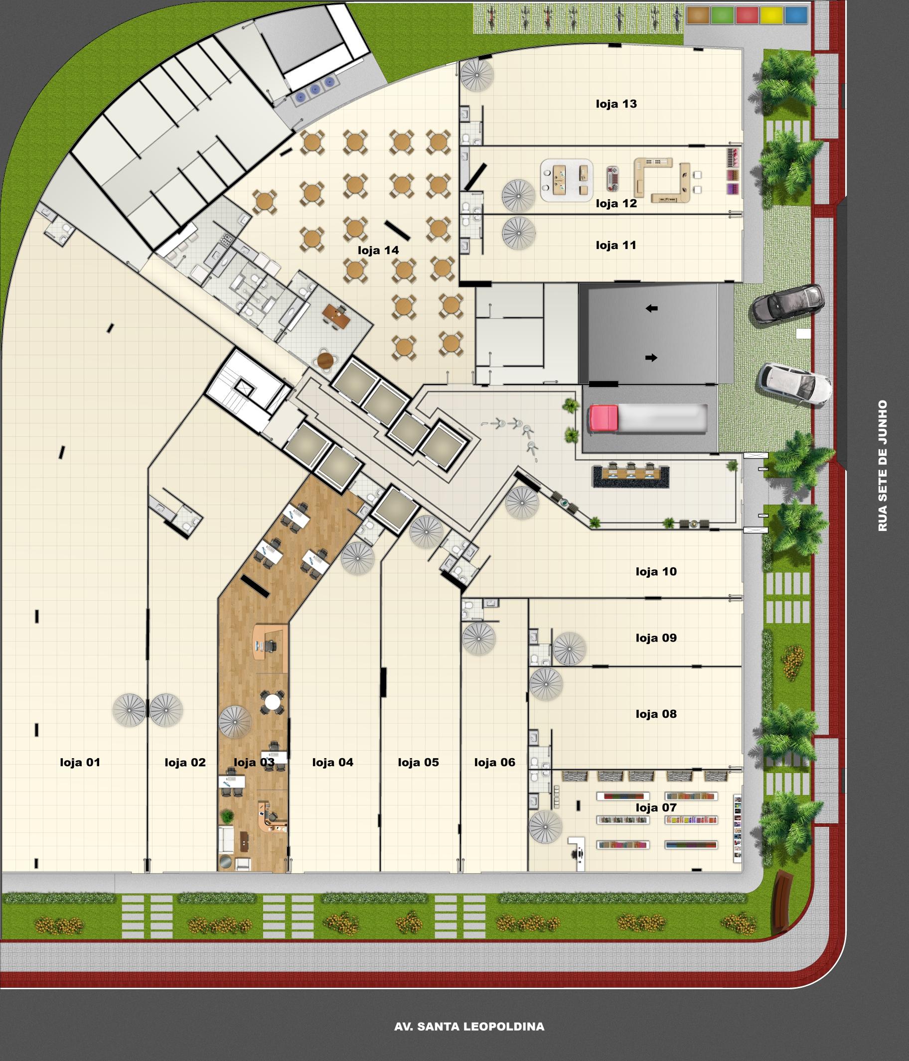 As lojas do Canal Office Tower terão suas vitrines e portas de entrada voltadas para a rua facilitando a visibilidadeeacessibilidade.