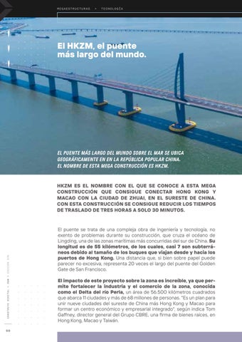 HKZM ES EL NOMBRE CON EL QUE SE CONOCE A ESTA MEGA CONSTRUCCIÓN QUE CONSIGUE CONECTAR HONG KONG Y MACAO CON LA CIUDAD DE ZHUAI, EN EL SURESTE DE CHINA. CON ESTA CONSTRUCCIÓN SE CONSIGUE REDUCIR LOS TIEMPOS DE TRASLADO DE TRES HORAS A SOLO 30 MINUTOS.