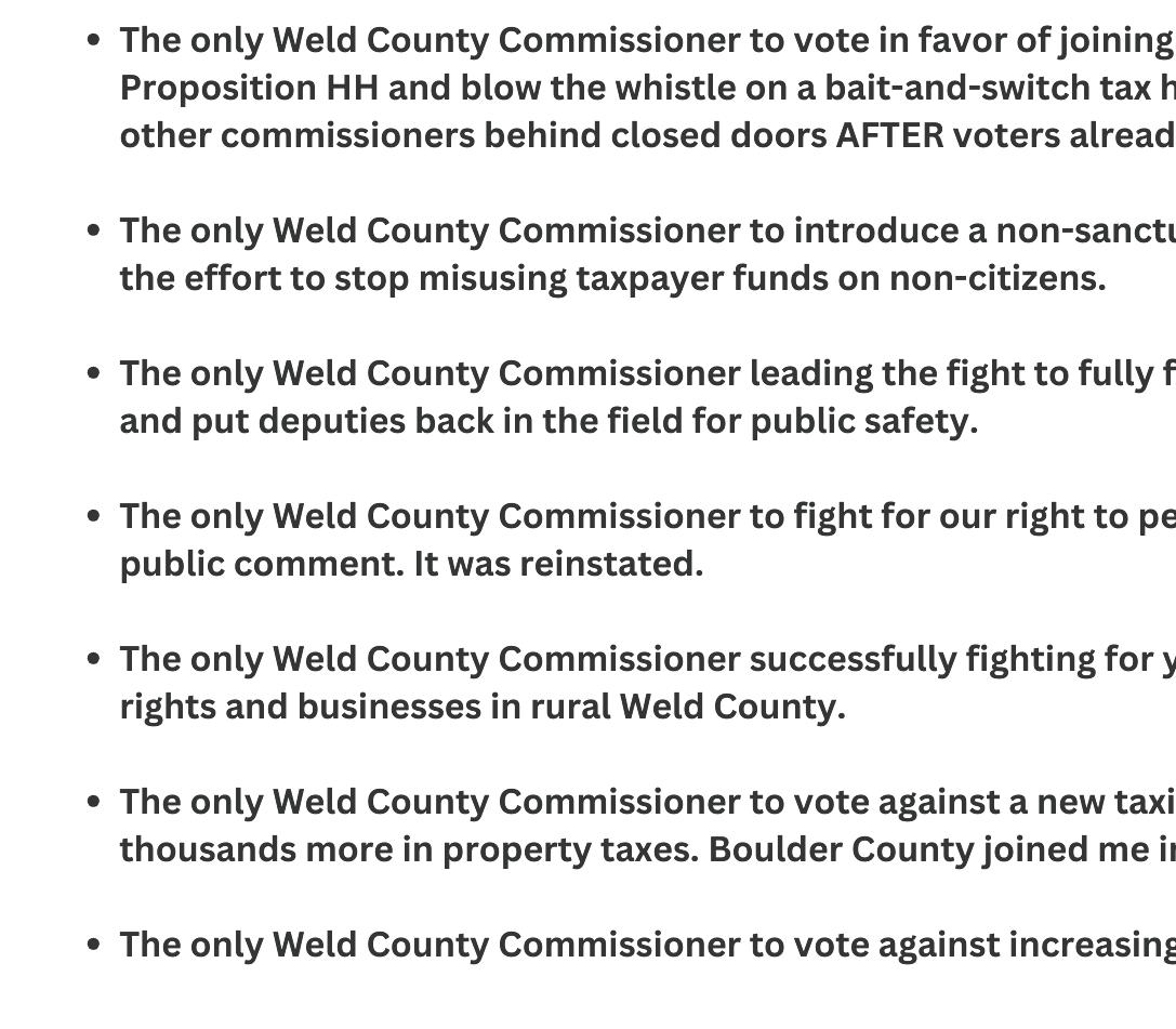 ose council members also pointed out my opponent was shaking her head during my presentation that Weld didn’t need to keep that excess tax revenue and negotiated with the other commissioners to raise taxes in a public work session.
