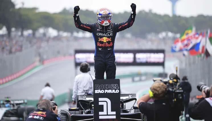 Max Verstappen se graduó de leyenda en Interlagos. El piloto de Red Bull prácticamente aseguró el título mundial de la F1, su cuarto en fila con una joya de manejo, fiereza y una pizca de suerte para sazonar, mientras que su compañero de equipo, el mexicano Sergio Pérez no pudo meterse en los puntos. El neerlandés de 27 años se sobrepuso a una calificación desafortunada, una penalización de cinco lugares en la parrilla, para luego de partir en la posición 18, navegar, sí navegar porque la pista del Gran Premio de Sao Paulo era un río hasta el triunfo.