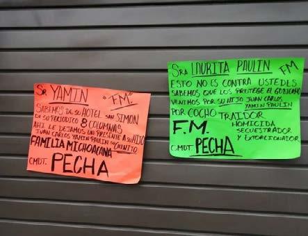 En el puente y en cortinas de locales ubicadas a un costado del paso peatonal, la policía municipal halló cartulinas con mensajes intimidatorios del grupo delictivo La Familia Michoacana en contra de la familia propietaria de varios negocios, entre ellos, de un periódico que circula en la capital mexiquense