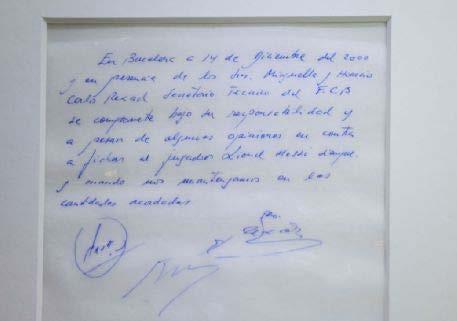 “En Barcelona, a 14 de diciembre del 2000 y en presencia de los Srs. Minguella y Horacio, Carles Rexach, secretario técnico del FC Barcelona, se compromete bajo su responsabilidad y a pesar de algunas opiniones en contra a fichar al jugador Lionel Messi siempre y cuando nos mantengamos en las cantidades acordadas”, dice la servilleta del primer contrato del capitán argentino.