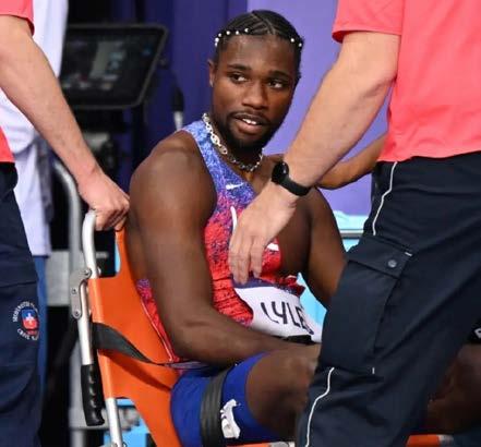 Tan pronto como cruzó la línea de meta en tercer lugar, Lyles se tumbó de espaldas en la pista. En unos momentos, estaba rodeado por entrenadores atléticos e integrantes del personal médico de los Juegos Olímpicos de París, quienes lo movieron hacia una pared mientras le administraban algún tipo de tratamiento. En un momento, se vio a Lyles usando una máscara antes de ser colocado en una silla que finalmente fue llevada al túnel cercano. Justo después de la serie de semifinales del miércoles, Lyles no pasó por la zona mixta de medios. En su lugar, fue llevado directamente al médico por un motivo no revelado. Durante la carrera del jueves, los ocho corredores tuvieron un comienzo bastante parejo. Lyles estuvo en la contienda desde el principio. Alrededor de la marca de los 100 metros, Tebogo y