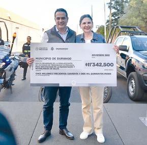 El Gobierno de Esteban Ville gas transparenta el uso de recur sos, expresó la titular de la secre taría del Bienestar, Rocío Rebollo Mendoza, al hacer entrega por parte de la Administración Esta tal, de 11.3 millones de pesos al municipio de Durango; monto recaudado de la regularización de vehículos de procedencia ex tranjera que serán utilizados en la pavimentación y rehabilitación de calles.