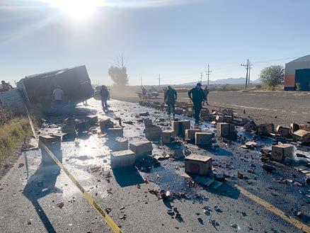 Guadalupe Victoria, Dgo.- La volcadura de un camión cargado con cerveza, ocurrida el martes por la tarde en la carretera libre a Gómez Palacio, derivó en la pérdida prácticamente total de su mercancía, que quedó esparcida por la cinta asfáltica; el chofer, por fortuna, resultó ileso.