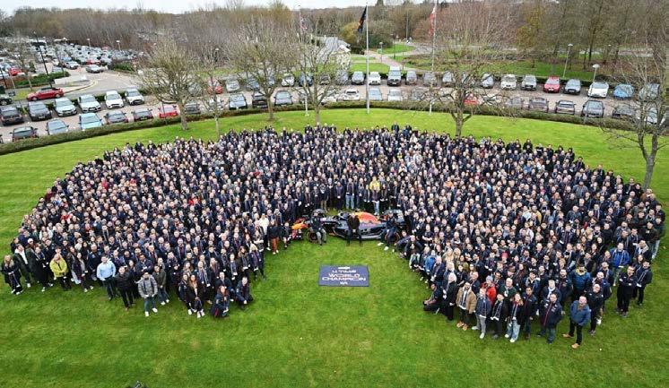 Pérez posó en una gráfica panorámica donde los empleados de las instalaciones donde se fabrican los monoplazas de Red Bull, rodearon el RB20