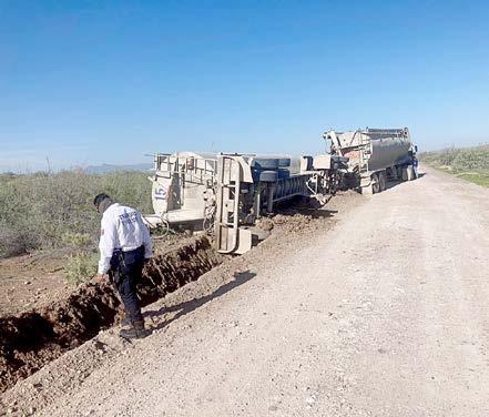 un tramo de terracería que une a Bermejillo y Ceballos, lugar en el que se encuentra una de las granjas de la empresa. Por fortuna, todo ocurrió a una velocidad moderada y Fidel mantuvo el control del tractocamión, por lo que nadie resultó lesionado; poco después llegó al lugar una grúa que se encargó de retirar el remolque siniestrado.