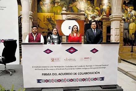 El convenio establece un precedente positivo entre las au toridades electorales, y las ins tituciones que trabajan con las comunidades y pueblos indígenas de Durango, el cual tiene como objetivo primordial la inclusión, labores coordinadas y realizar ac ciones que tengan como finalidad la promoción de la participación ciudadana y la democracia, to mando en cuenta en todo mo mento los usos y costumbres de