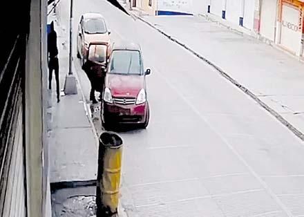 En 45 segundos el niño fue interceptado, tomado por la cin tura y subido al vehículo por un sujeto; en tanto otro hombre se coloca entre el auto y el menor; sirviendo de muro, saca un arma y con ella amenaza a la mujer, a quien incluso le arrebata una mo chila y la lanza al arroyo vehicular.