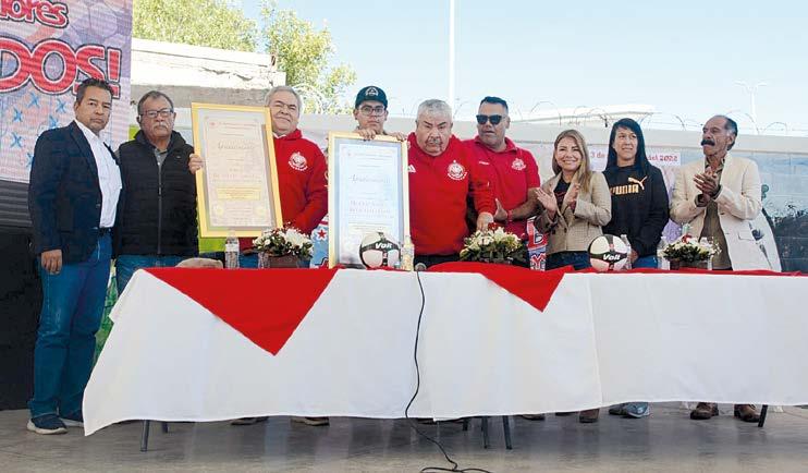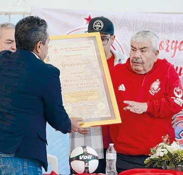 Víctor Blanco Pinedo, presi dente del Club Deportivo Ma derera, entregó dos placas de re conocimiento a Jorge Blanco y Miguel Ortiz, ejemplo de la pro moción deportiva en la ciudad de Durango y fundadores, además, del Torneo de Campeones de Año Nuevo.