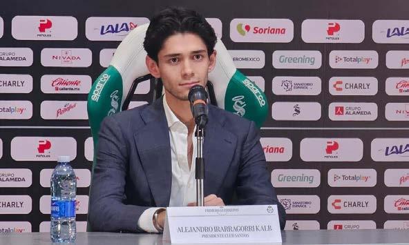 Alejandro Irarragorri Kalb asumió la presidencia en sustitución de Dante Elizalde, quien estuvo durante seis años en el cargo. En conferencia de prensa fue anunciado Aleco Irarragorri Kaleb como el nuevo presidente de Club Santos, quien con 24 años se convierte en el directivo más joven en la Liga MX y tomará el puesto de Dante Elizalde. El joven directivo fue presentado como nuevo cabeza del equipo lagunero, el cual vive una crisis deportiva y ha visto cómo su afición se ha alejado de estadio en el Apertura 2024. Alfonso Villalva, Director General de Grupo Orlegi, hizo oficial la llegada del nuevo directivo. “Quiero comunicarles que Orlegi Sports ha culminado un proceso de mucha reflexión, análisis y tomamos la decisión de hacer un nombramiento de nuevo presidente con la visión. Los invito a que nos sumemos a este nuevo inicio, acompañarlo en su visión, talento y frescura. Esto nos llevará al futuro. Se habla mucho de las edades. Hay una forma de llegar al futuro y es con los jóvenes y no es problema de merecer una posición o cargo sino también demostrar por conocimientos, pasión y compromiso y todas las reúne Aleco Irarragorri Kaleb. Con él al mando de este barco podremos aspirar junto con todos ustedes, club y colaboradores”, declaró ante los medios de comunicación el directivo.