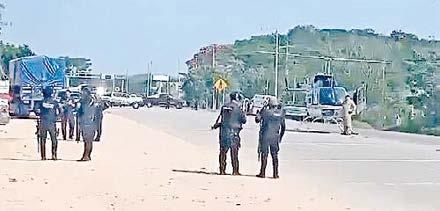 Elementos de la policía de Chiapas resguardan el tramo carretero Ocozocoautla-Villaflores, en Chiapas, donde fuerzas federales y estatales fueron atacadas desde un rancho por presuntos delincuentes, lo que derivó en un enfrentamiento en el que murieron un miembro de la Guardia Nacional y un soldado del Ejército.