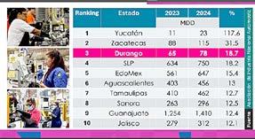 El top ten de estas inversiones lo encabezan Yucatán, Zacatecas y Durango, además de San Luis Potosí, Estado de México, Aguascalientes, Tamaulipas, Sonora, Guanajuato y Jalisco, como las entidades que entre 2023 y 2024 han logrado atraer y crecer el nivel de inversiones en el mencionado sector.