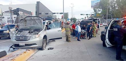 toso accidente ocurrido en el bulevar Guadiana dejó cuantiosos daños en un total de tres vehículos, dos que se encontraban en movimiento y uno más estacionado; tres personas resultaron lesionadas.
