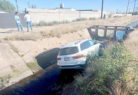 Durango, Dgo.- Una camioneta de lujo resultó con daños significativos luego de caer al canal de riego que bordea la vialidad Naranjo, en la zona sur de la capital del estado; por fortuna, todo quedó en daños materiales.