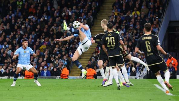 das. Un gol “Zlatanesco”, que recordó al que el sueco le hizo a Italia en la ya lejana Euro de 2004. Y encima casi ni lo celebró, como si fuera lo más normal del mundo. Esa maravilla claramente calmó a los ‘Sky Blues’, que en los diez minutos siguientes hicieron otros dos, primero con un remate bombeado de John Stones, que ha marcado en dos partidos seguidos, y el cuarto llegó por medio de Haaland con una definición más habitual desde dentro del área. El ‘nueve’ atesora 44 goles en esta competición, con lo que supera a Neymar (43) e iguala a Didier Drogba (44). El siguiente en la lista es Mohamed Salah, con 45, y después tendrá a Filippo Inzaghi y Eusebio con 46 ambos. A diez minutos para el final, Guardiola le cambió y el noruego se quedó sin unirse a Vinícius y Raphinha como los autores de un ‘hat trick’ esta jornada de ‘Champions’.