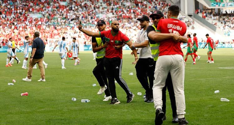 empate agónico 2-2 en el 15’ minuto de descuento para la Selección Argentina Sub 23, pero el público marroquí comenzó a lanzar objetos contundentes y pirotecnia contra los jugadores sudamericanos. Además, hubo hinchas que invadieron el cam-