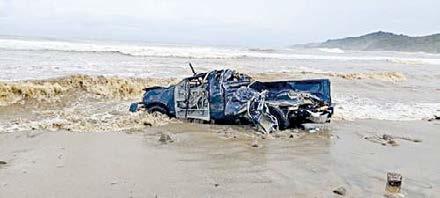 Una camioneta fue arrastrada hasta la orilla de la playa Sayulita, municipio de Bahía de Banderas, Nayarit, tras los fuertes aguaceros y vientos huracanados de Roslyn en la entidad. Foto tomada de Facebook