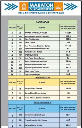 Sigue en desarrollo el Maratón Guadalupe Reyes, evento organizado por Actividad Física y Deportiva Integral Comunitaria, cuya dinámica consiste en que cada participante se active todos los días en un periodo que comprende del 12 de diciembre de 2022 al 6 de enero de 2023, ya sea corriendo o trotando o también en el uso de la bicicleta y nadando, señalando que lo importante no es ganar, sino hacerlo diariamente para cumplir con este desafío, aunque se lleva un control de los kilómetros sumados gracias a los reportes que publique cada participante en sus redes sociales.