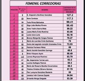 con 117.3 y Tulia Pérez es tercera con 96.41. En los varones la mayor sumatoria es de Rafael Arámbula con 132.54, le sigue con 132.3 Héctor Daniel Mendoza y Elías Ricalday se coloca tercero con 112.3. En la modalidad de Ciclismo Marta Flores digita 248.66 y en la natación Norma Orona ha recorrido 68.71 kilómetros.