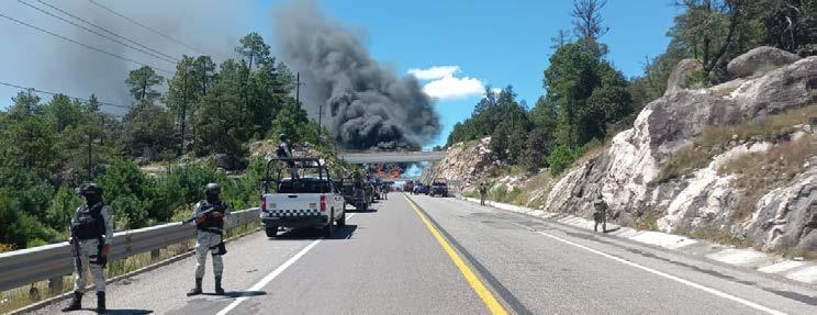 Rafael Sarmiento Aguirre, presidente de la Asociación de Centros Ecoturísticos, informó que la Ruta de la Moto Durango-Mazatlán, misma que lleva realizándose 15 años consecutivos, fue cancelada, generando pérdidas calculadas hasta en 14 millones de pesos, aproximadamente. En tanto la secretaria de Turismo, Elisa Haro Ruiz, con rmó que al menos 100 turistas provenientes de estados como Zacatecas, Chihuahua y Coahuila que se dirigían a Mazatlán se habrían quedado en hoteles de Durango por la inseguridad en las carreteras, retomando su camino hoy.