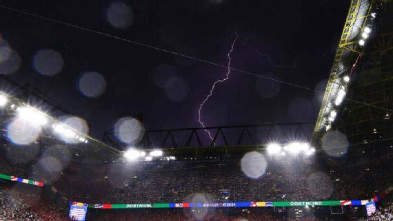 Después de varios minutos de intensas lluvias en el Signal Iduna Park, el árbitro inglés Michael Oliver frenó el encuentro entre el anfitrión y el conjunto danés, que estaba empatado sin goles, por la intensa tormenta eléctrica que caía.