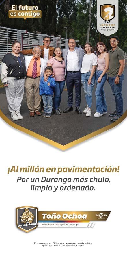 duranguenses, tanto en la ciudad como en el medio rural”, concluyó Rebollo. Con dos años de intenso trabajo, respaldado constantemente por el gobernador Esteban Villegas, Toño Ochoa ha consolidado un gobierno que no solo construye infraestructuras, sino también un futuro mejor para la gran familia duranguense. Con la vista puesta en el próximo año, Rebollo expresó su con anza en que este será otro año de logros signi cativos para Durango bajo el liderazgo de Toño Ochoa.