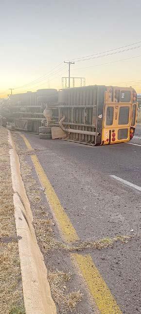 Durango, Dgo.- Un autobús de pasajeros, habilitado para el transporte de personal de una empresa maquiladora, volcó este miércoles por la mañana en la salida a Zacatecas; durante las operaciones de abanderamiento, realizadas por elementos de la Policía Estatal, una o cial de esta corporación fue atropellada.