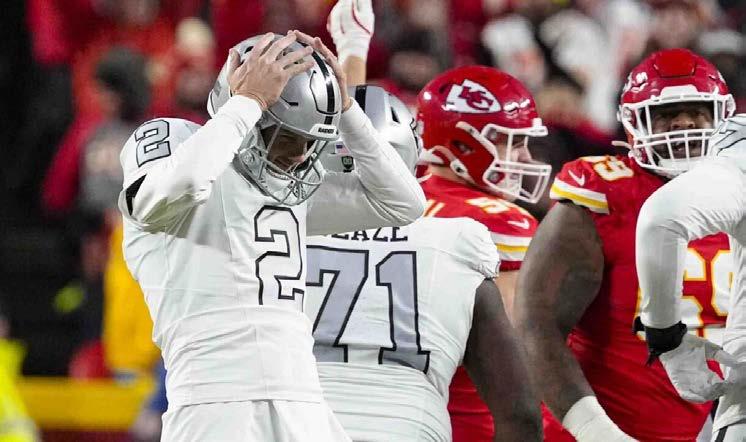 8 con poco menos de dos minutos por jugar, y Aidan O'Connell los llevó rápidamente más allá del medio campo. Eventualmente, detuvo el reloj al azotar el balón en la 32 de Kansas City. En lugar de intentar un gol de campo que podría haber sido el de la victoria --Daniel Carlson ya había fallado tres desde más de 50 yardas--, los Raiders se alinearon para hacer una jugada más. El centro Andre James lanzó el balón cuando O'Connell no lo