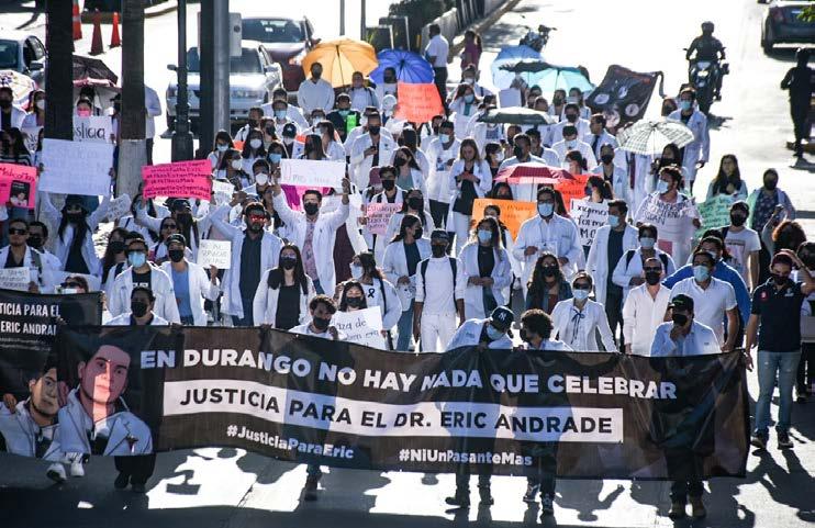 Cientos de estudiantes de Medicina marcharon por las principales calles de la ciudad exigiendo justicia para Érick Andrade, pasante asesinado en el hospital de Pueblo Nuevo. Claudia Díaz Pérez, delegada del IMSS, señaló que los 61 pasantes que realizan su servicio social en el medio serán retirados y reubicados en la capital y La Laguna.
