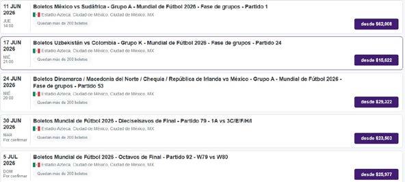 Este comportamiento en el mercado secundario se presenta pese a que la FIFA ha ido liberando fases de venta directa y de reventa oficial. Los aficionados que no consiguieron boletos en preventas o en sorteos oficiales han recurrido a sitios como StubHub, donde los precios por partido pueden variar ampliamente. Los precios oficiales publicados por FIFA para los boletos de la fase de grupos, incluido el México vs Sudáfrica, se estructuran en categorías de acuerdo con la ubicación en el estadio y la etapa del torneo. En la fase de grupos, los boletos pueden tener precios desde aproximadamente 370 dólares, unos 6,900 pesos; hasta 1,825 dólares, es decir, más de 34 000 pesos para los mejores asientos, más de cuatro veces la cantidad oficial en la página del máximo orga-