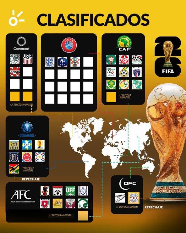 En total, 43 plazas son directas (incluyendo tres anfitriones), y dos se decidirán en repescas interconfederativas entre 6 equipos (AFC, CAF, CONCACAF x2, CONMEBOL, OFC), asegurando un torneo más inclusivo que nunca.