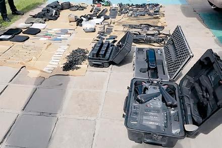 motriz fueron localizados dentro los siguientes elementos bélicos: 1 fusil de asalto, 1 mira telescópica, 2 ametralladoras, 2 armas cortas, 4 granadas de fragmentación, 1 aditamento lanzagranadas, 1,645 cartuchos útiles de diversos calibres, 8 cargadores para fusil de asalto. Además de: 9 cintas metálicas eslabonadas para ametralladora, 4 chalecos tácticos, 6 placas balísti-