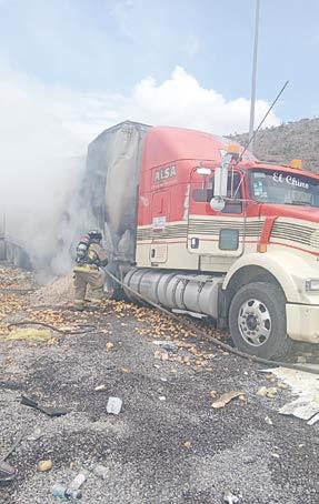 Durango, Dgo.- Elementos del Cuerpo de Bomberos intervinieron a tiempo para controlar el incendio de un tractocamión que, al quedar sin frenos, fue ingresado por su operador a la rampa de frenado ubicada a un par de kilómetros de la Plaza de Cobro “Durango” de la Supercarretera a Mazatlán.