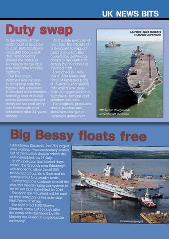 Duty swap In the waters off the south coast of England in July, HMS Illustrious and HMS Ocean met and, symbolically passed the baton of succession as the UK’s sole helicopter landing platform. The two ships steamed side by side, in company with the frigate HMS Lancaster, to conduct a ceremonial handing over of duties before Illustrious peeled away for her final entry into Portsmouth and retirement after 32 years service.