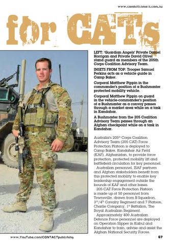 Australia’s 205th Corps Coalition Advisory Team (205 CAT) Force Protection Platoon is deployed to Camp Baker, Kandahar Air Field (KAF), Afghanistan, to provide force protection, protected mobility lift and battlefield circulation for key personnel. Australian personnel, ISAF partners and Afghan stakeholders benefit from this protected mobility to enable key leadership engagement outside the bounds of KAF and other bases. 205 CAT Force Protection Platoon is made up of 50 personnel from Townsville, drawn from B Squadron, 3rd/4th Cavalry Regiment and 7 Platoon, Charlie Company, 1st Battalion, The Royal Australian Regiment. Approximately 400 Australian Defence Force personnel are deployed on Operation Slipper in Kabul and Kandahar to train, advise and assist the Afghan National Security Forces. www.YouTube.com/CONTACTpublishing
