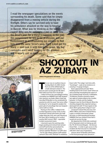 he sun rose on southern Iraq on Sunday, March 23, 2003. Smoke from an oil fire drifted lazily in a futile attempt to block it. The forecast said it would get hot. We didn’t fully realise just how hot it would get. I rolled out from the camouflaged netting concealing our HMMWV that Staff Sergeant John Jamison, my Public Affairs Chief, had stencilled ‘El Bandito’ on the windshield. He greeted me with his usual, “Got some coffee brewing, Sir,” as he stooped to awaken the green pile of camouflage that was Sergeant James Goff, our driver. Passing on the coffee, I walked to the Combat Operations Center (COC) to find Lieutenant Colonel John Ewers, the Staff Judge Advocate (SJA), who said, “Round up the team. We’re heading out to conduct another RIAT mission” (RIAT – reportable incident assessment team). I returned to give the warning order, began packing and noticed that Jamison and Goff had further personalised the vehicle with call-signs on the doors. Jamison painted “Windows” on Goff’s door – for his ugly military glasses. Goff marked Jamison’s door with, “Axehole” in retaliation,