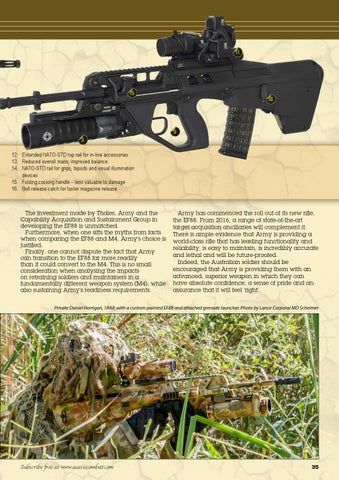 Army has commenced the roll out of its new rifle, the EF88. From 2016, a range of state-of-the-art target acquisition ancillaries will complement it. There is ample evidence that Army is providing a world-class rifle that has leading functionality and reliability, is easy to maintain, is incredibly accurate and lethal and will be future-proofed. Indeed, the Australian soldier should be encouraged that Army is providing them with an advanced, superior weapon in which they can have absolute confidence, a sense of pride and an assurance that it will feel ‘right’.