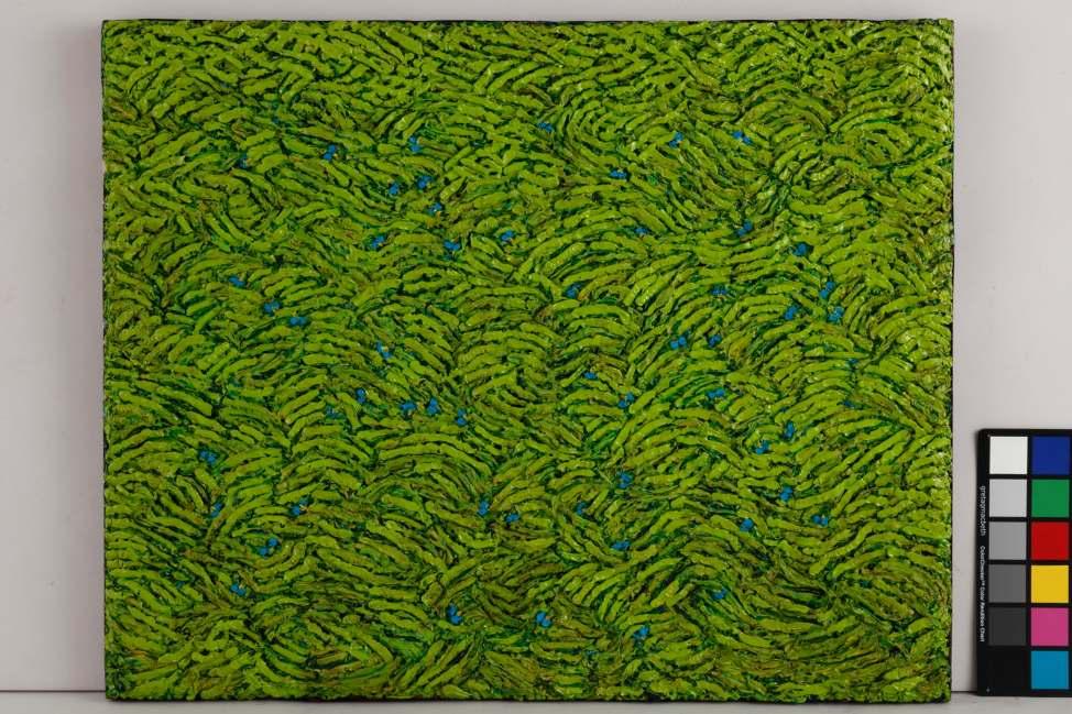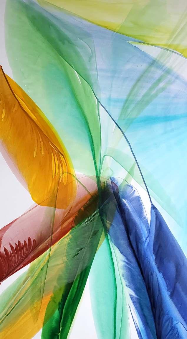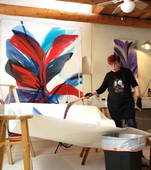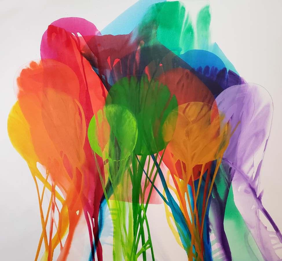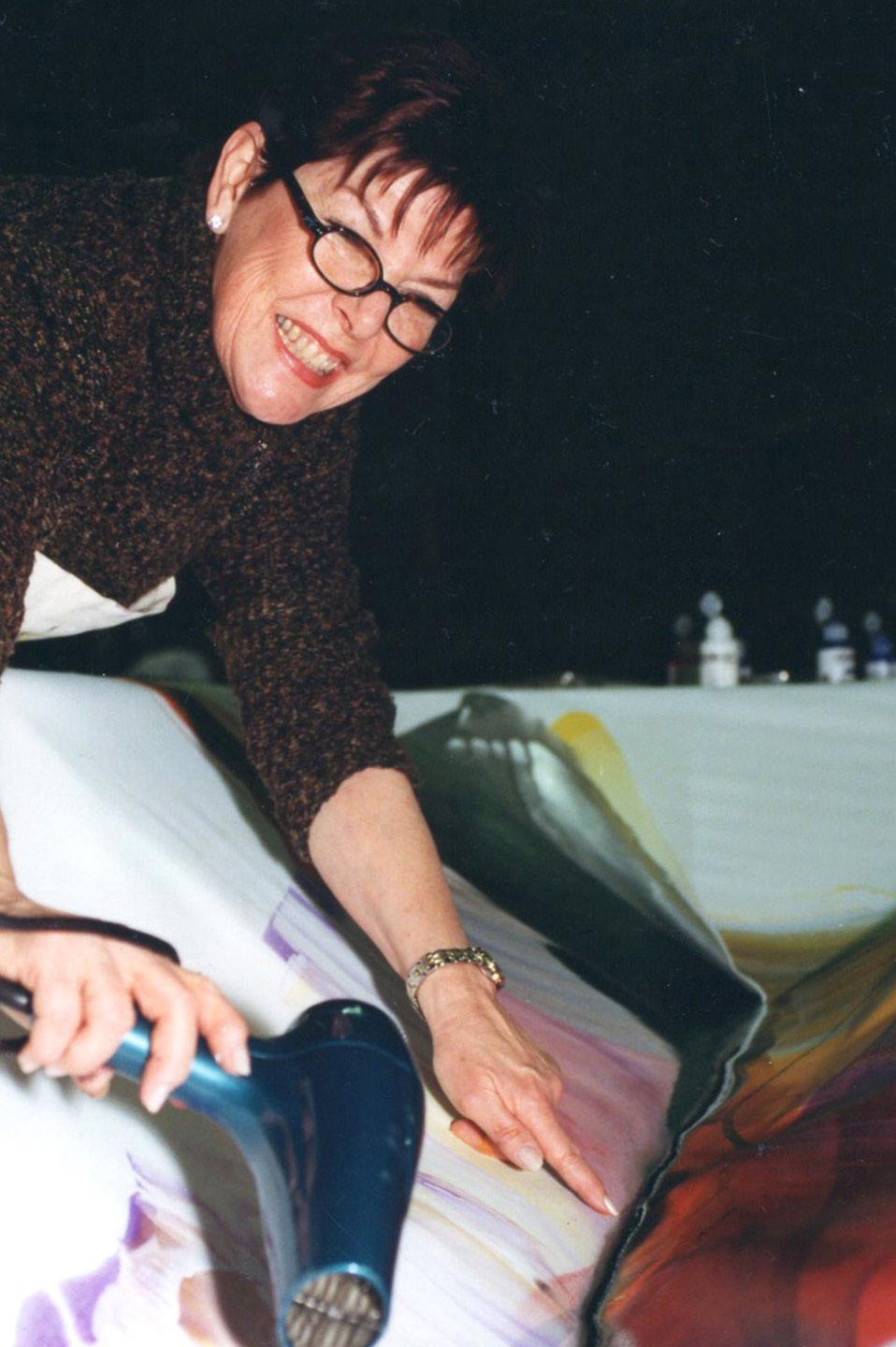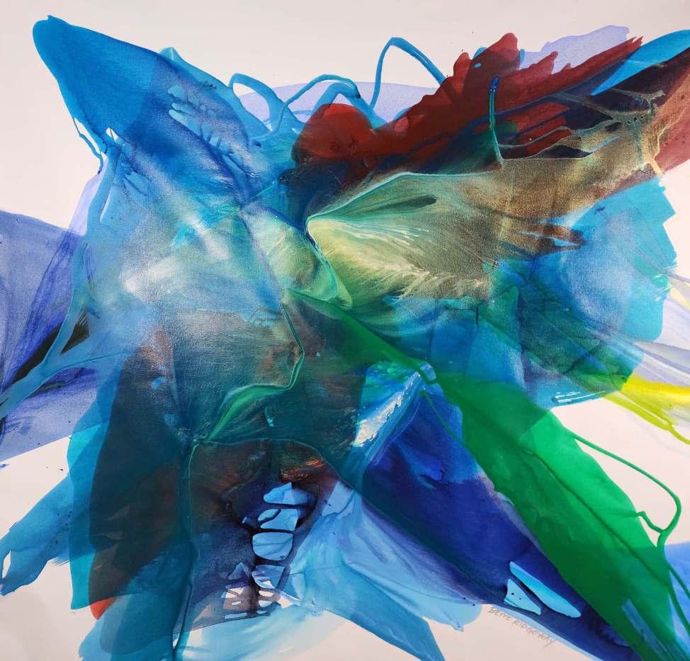Celebrated for her large-scale, luminous poured canvases, Bette Ridgeway has devoted five decades to developing her unusual pouring technique, garnering international recognition in the process. Born in Tupper Lake, a small village in the Adirondack Mountains in New York, she has traveled the globe - studying, painting, teaching and exhibiting her work while simultaneously immersing herself in the customs and colors of diverse cultures of Africa, Australia, Europe, Asia, Mexico and South America. She studied and taught painting during lengthy stays in Antananarivo, Madagascar; Canberra, Australia; and Santiago, Chile.