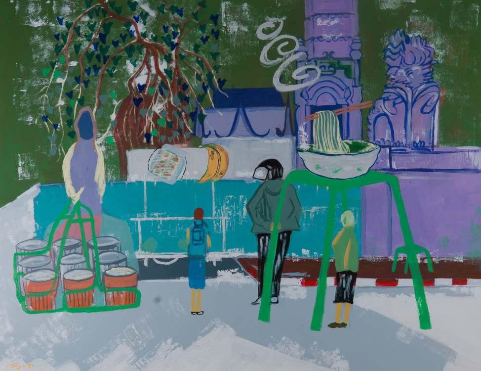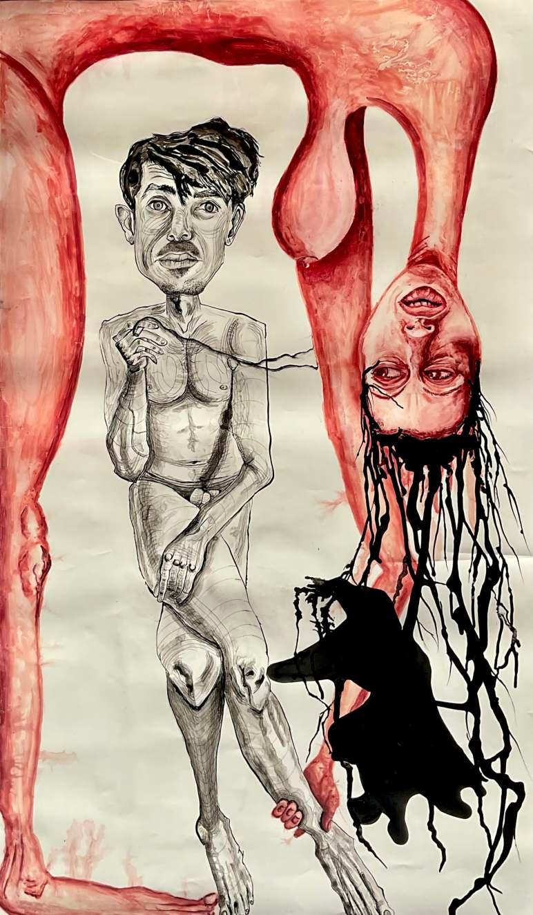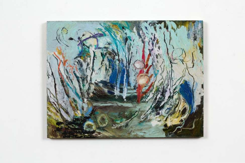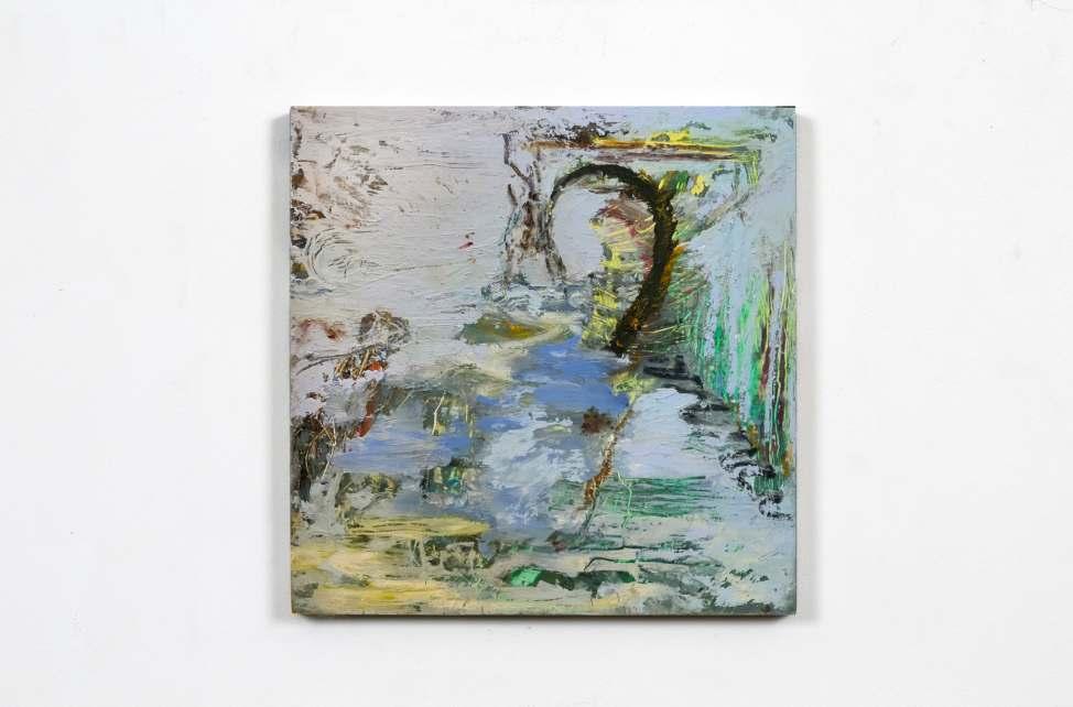 Though primarily working on his oil paintings, he is also using drawings and watercolours during the creation process. The works are layered, densely merging his diverse range of mark making and balance between the figurative and the abstract.