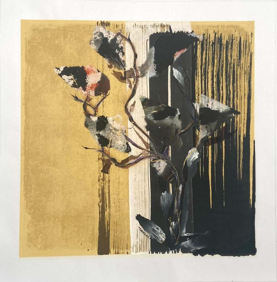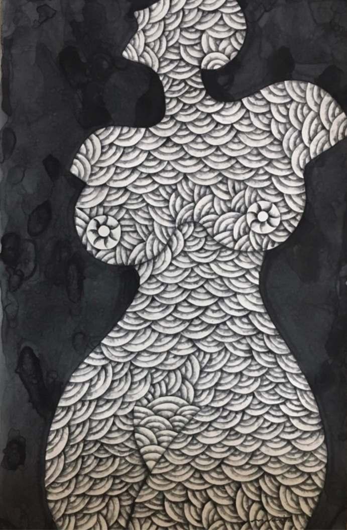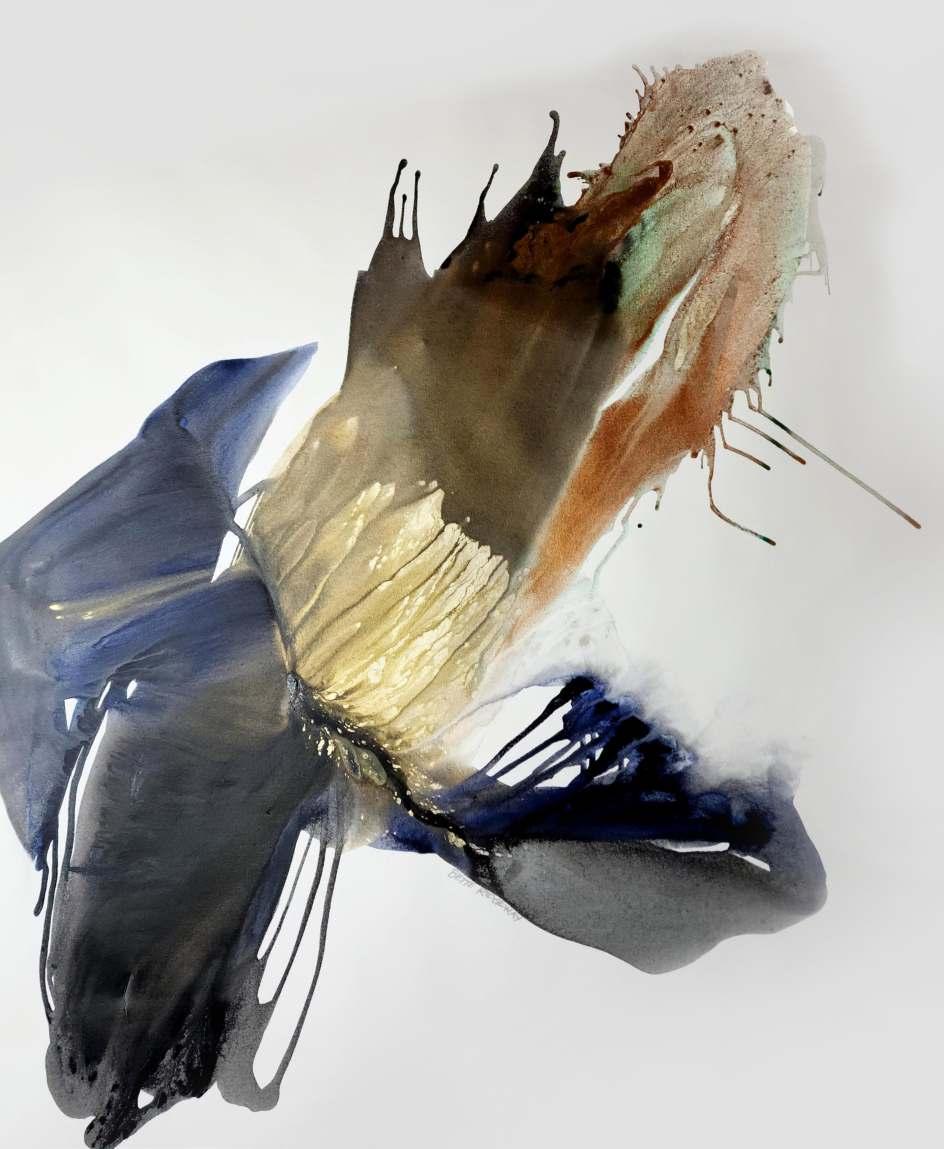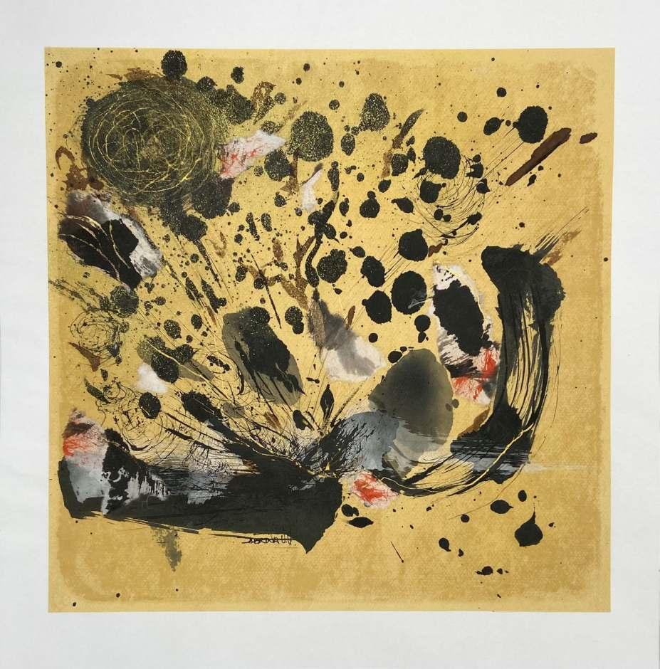 Through abstract forms, and much thought, Sabrina dares to share her inner self. Strokes, lines, textures, colors, are carefully collected, selected, and placed in a way she sees her unique expression materialize. She prefers working on paper, because of its diverse qualities, it is resistant as well as delicate. She believes that the way in which the paper responds to the materials she uses resembles the acts of receiving, giving, it can be resistant, absorbent, flexible, etcs. With continuous circular movements she grinds the sumi stick on a suzuri stone, that induces her into a meditative state, which is an essential part of her creative process. By slowly adding water a flowing thick ink is produced, she identifies it with the course of life itself. Black is the predominant color in her work, adding only subtle traces of color that suggests some kind intimacy .