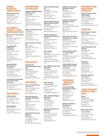 Clay & Land Insurance, Inc. Louis Clay 866 Ridgeway Loop Road, Suite 200 Memphis, TN 38120 901-767-3600 lclay@clayandland.com David D. Milan AgencyNationwide Insurance David Milan 281 Germantown Bend Cove. Cordova, TN 38018 901-753-9960 miland@nationwide.com Fowler Insurance & Employee Benefits, Inc. Al Fowler 3066 Fountainside Drive, Suite 101 Germantown, TN 38138 901-756-8227 fowlerinsurance.net al@fowlerinsurance.net Glass Group Margot Pera 6800 Poplar Avenue, Suite 122 Germantown, TN 38138 901-843-1190 glassinsurancegroup.com wglass@glassinsurancegroup. com Laura McKay State Farm Insurance Laura McKay 2199 S. Germantown Rd Germantown, TN 38138 901-590-1929 lauramckayinsurance.com laura@lauramckayinsurance. com New York Life Richard McBryde 1715 Aaron Brenner Drive, Suite 701 Memphis, TN 38120 901-762-4752 rmcbryde@newyorklife.com Page, Chaffin & Riggins Insurance Kirk Riggins 8122 Walnut Run Cordova, TN 38018 901-755-5526 kirk@pcrins.com Pam Burch State Farm Insurance Pam Burch 1217 S. Germantown Rd. Germantown, TN 38138 901-266-0070 pamburch.com pam@pamburch.com