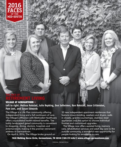 VILLAGE AT GERMANTOWN>>> Left to right: Melissa Rukstad, Julie Repking, Don Selheimer, Ron Rukstad, Jesse Crittendon, Pam Leet, and Susan Edwards The Village is a Life Plan community offering independent living and a full continuum of care. The Village’s affiliation with Methodist Healthcare offers unparalleled health-related benefits. The lushly landscaped gated community is convenient to shopping, dining, doctors, hospitals and entertainment, making it the premier retirement address in Germantown. On April 6, 2016, The Village broke ground on