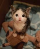 A week later, taking Lily Bear the dog outside in the morning, I noticed a truly tiny kitten standing all by its lonesome next to the deck. In full disclosure, we take care of a neighborhood feral cat whom we’ve not yet been able to trap and spay, and we had observed a few weeks earlier she looked possibly pregnant. Here was the blueeyed proof, an unwanted runt, mewing up from a pile of oak leaves.