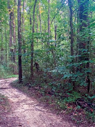 Nesbit Park is located in Bartlett, Tennessee3. (5760 Yale Road to be exact.) It has some amazing bike and walking trails. It’s a place of peace and adventure. During my rst Nesbit Park, aka Stanky Creek, experience, I learned how strong I truly am. It was during a Memphis Runners Club Winter O -Road Race Series. I’d never ventured inside the park before, so this was a completely new experience. During this 8K race, I struggled through narrow paths, hills, and ravines where I had to use my non-existent upperbody strength to pull myself up. ( ere was a lot of cheering and several attempts before I accomplished it.) Somewhere along the marked path, I started listening to the birds. At some point, I looked up and around at the trees. I realized that I hardly ever look up anymore. Eventually, I looked down to nd that I couldn’t see any of the race markers. I couldn’t hear anyone. I couldn’t see anyone. So I stopped moving, put my hands on my hips like Forrest Gump, and I took a deep breath in and exhaled. And I wandered. I skipped. I frolicked. I jogged. I walked. I didn’t think. I didn’t worry. I just existed. With no requirements, I just existed and lived in that moment. Or moments, if I’m honest. (Don’t fret. I was never truly lost during this race. An earlier runner had knocked a race marker down and I wasn’t paying attention. I didn’t see or hear anyone because I was dead last and very far behind.)